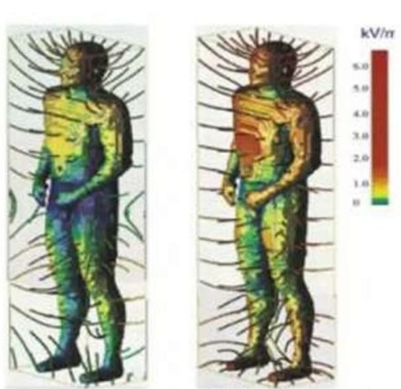- Low-frequency electric fields influence the human body just as they influence any other material made up of charged particles. When electric fields act on conductive materials, they influence the distribution of electric charges at their surface. They cause current to flow through the body to the ground.
